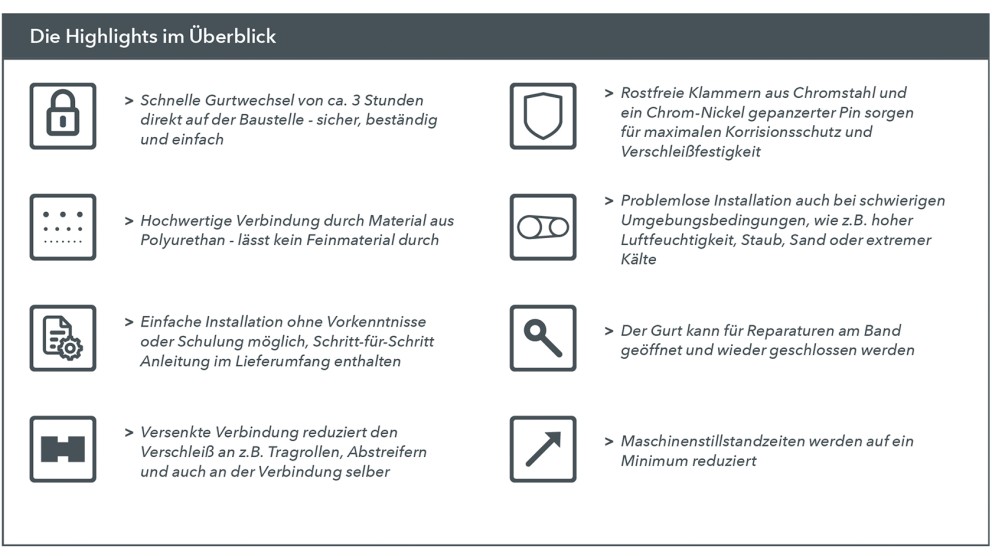 • Es muss nicht das komplette Förderband zerlegt werden (wie bei den endlosen Gurten)