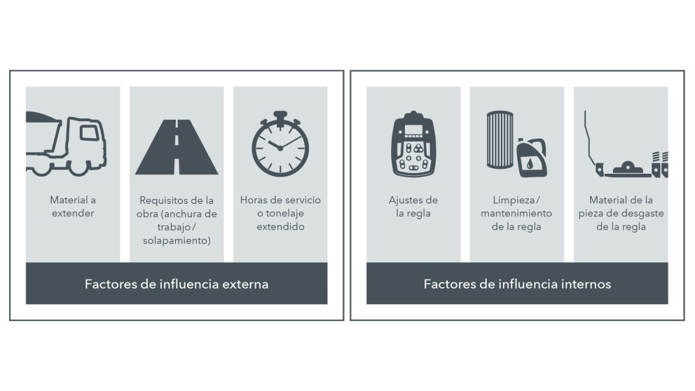 Todos los elementos de las reglas de extendido, y en especial los que están directamente implicados en la compactación (listones de támper, chapas deslizantes y listones de presión), están sometidos a un fuerte desgaste, que es mayor o menor en función del material. Los motivos que lo explican son diversos. Los fenómenos de desgaste se pueden retrasar relativamente, pero es imposible evitarlos por completo. La suciedad, el montaje incorrecto o elementos de otros fabricantes con una construcción diferente no solo perjudican la productividad y las calidades del extendido, sino que también fomentan el desgaste de otros componentes.