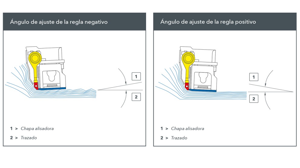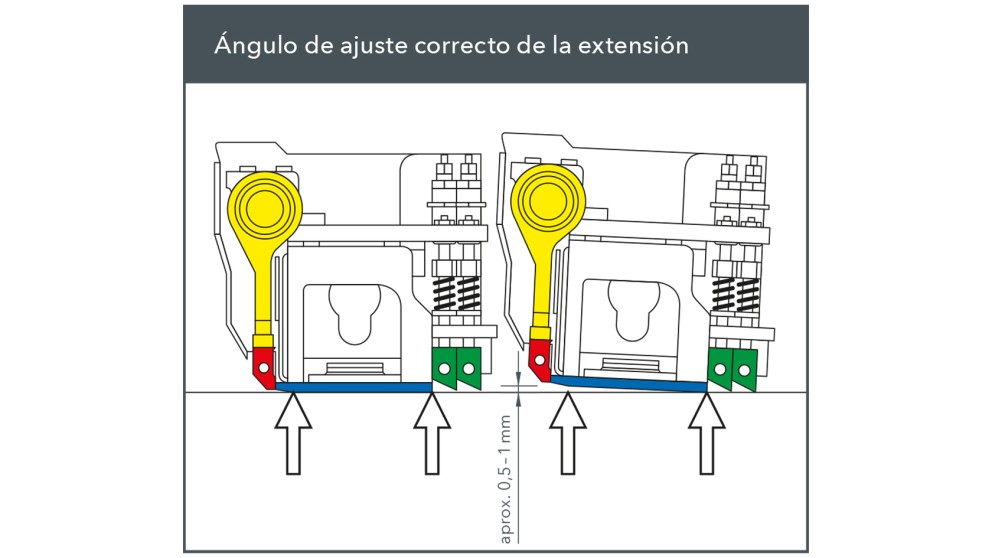 Todas las chapas deslizantes de una regla extensible deben presentar el mismo ángulo de ataque para que las distintas anchuras de extendido no perjudiquen la flotabilidad de la regla. Para ello, al configurar la regla, el borde delantero de la chapa deslizante de las piezas extensibles debe estar 0,5-1 mm más alto que su borde trasero.
