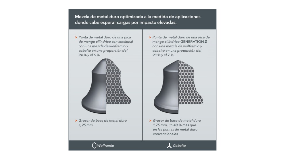 Las picas de mango cilíndrico de la GENERATION destacan por características de producto únicas que les permiten sobre todo reducir los costes operativos. Gracias a la geometría de punta de metal duro optimizada con base de metal duro reforzada y al diseño de mango adaptado, las picas de esta serie de productos están diseñadas para soportar altas cargas por impacto, por lo que constituyen la solución ideal para campos de aplicación como el reciclaje y la estabilización. El volumen del cuerpo de acero relativamente grande en comparación con las picas de mango cilíndrico convencionales y el disco de desgaste reforzado dan como resultado la durabilidad más larga posible de las herramientas y una protección ideal de las piezas superiores de los portapicas precisamente en aplicaciones con materiales abrasivos.