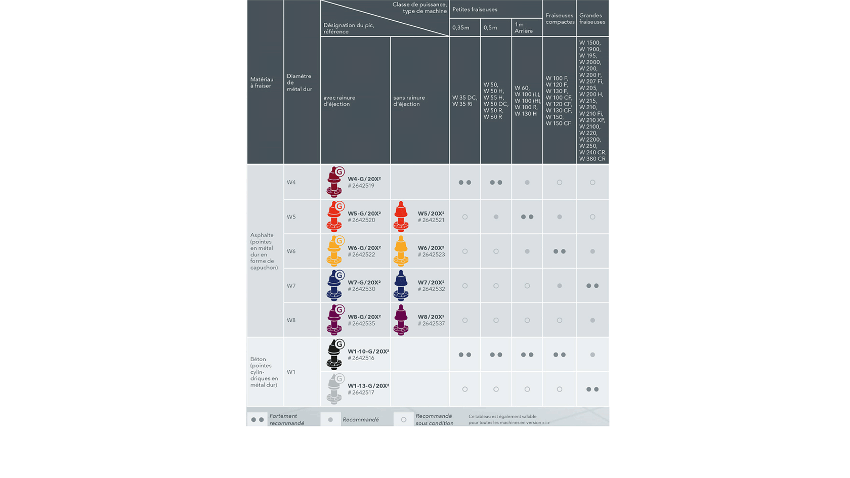 Grâce au codage couleur pratique de la GENERATION X², le choix des pics les plus adaptés à l’application est encore plus rapide. Les différentes dimensions du carbure sont identifiées à l’aide de différentes couleurs (p. ex. W1-10-G ... = noir, W6 ... = orange, etc.). L’identification par la lettre G (pour « groove », rainure) sur le symbole du pic permet de savoir en un coup d’œil si le pic est doté ou non d’une rainure d’éjection.