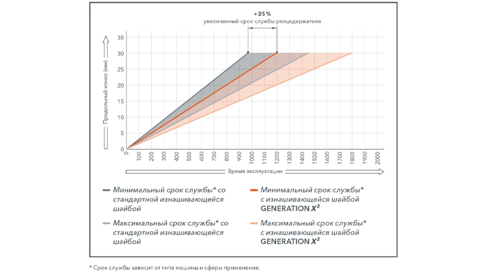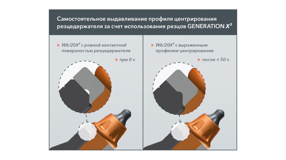Резцы с круглым хвостовиком поколения GENERATION X² отличаются уникальными характеристиками, которые позволяют, в первую очередь, существенно снизить эксплуатационные расходы. Новая изнашивающаяся шайба со специальным профилем паза улучшает центрирование и действительно оптимизирует ротационную характеристику. Благодаря этому твёрдый сплав в течение продолжительного времени сохраняет свою способность к резанию, за счёт чего обеспечивается оптимальное использование его свойств. Кроме того, профиль паза снижает продольный износ резца с круглым хвостовиком и увеличивает срок службы до 25 %.