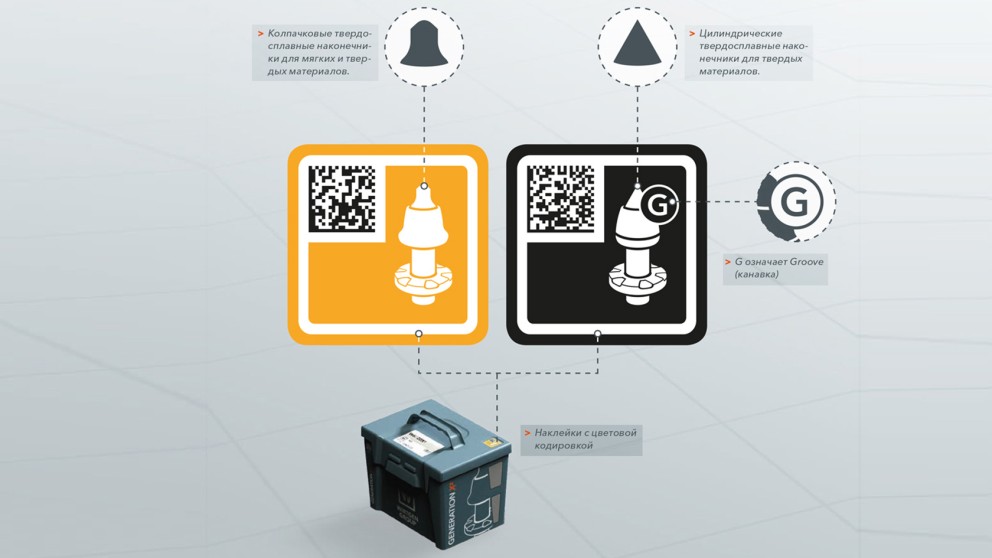 Практичная цветовая кодировка поколения GENERATION X²позволяет ещё более быстро подобрать нужные резцы. Размеры твердосплавного наконечника обозначены различными цветовыми оттенками (например, W1-10-G ... = черный, W6 ... = оранжевый и т. д.). Буквенное обозначение G (Groove = канавка) на символе резца позволяет сразу же определить, располагает ли резец пазом.